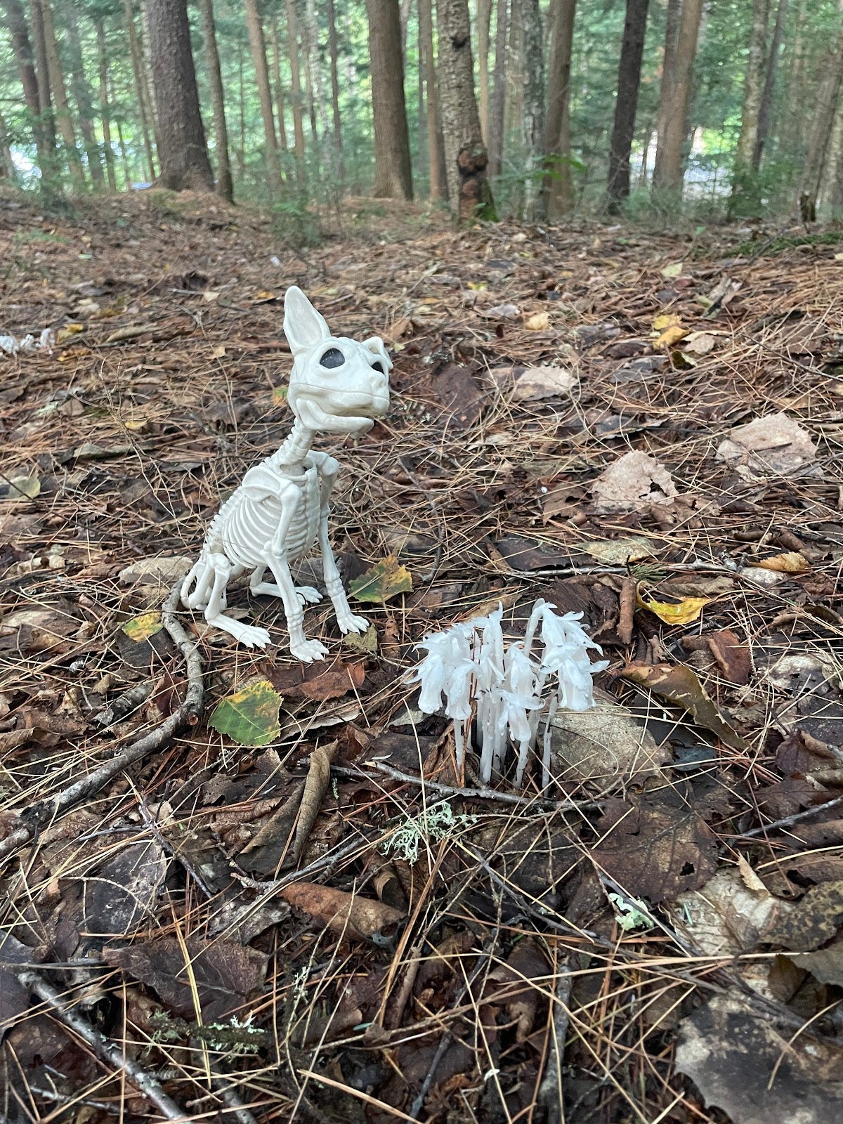 Today while exploring the forest around our campsite, Bones and I came across an unusual plant. It goes by many names; Ghost Plant, Ghost Pipe, Indian Pipe and Corpse Plant just to name a few. Its scientific name is Monotropa uniflora.